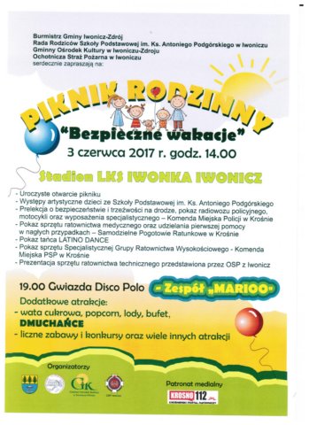 W sobotę, 3 czerwca, Rada Rodziców, przy współpracy z Gminnym Ośrodkiem Kultury oraz Ochotniczą Strażą Pożarną w Iwoniczu i wsparciem burmistrza, Pana Witolda Kocaja, zorganizowała piknik rodzinny „Bezpieczne wakacje”. Odbył się on na stadionie LKS Iwonka, gdzie urządzono scenę, zainstalowano olbrzymi zamek z dmuchanymi zjeżdżalniami, stanowisko do malowania twarzy, ustawiono ławeczki i stoliki oraz stoiska ze smakołykami. Każdy mógł znaleźć tu coś dla siebie – od pieczonych kiełbasek po lody i napoje. Można też było zakupić słodkie pudełka z kawałkami ciasta, które upiekli rodzice, by zdobyć fundusze, tak bardzo przydatne na liczne potrzeby szkoły. Przybyłe na imprezę rodziny miały możliwość uczestniczenia w wielu atrakcjach popołudnia i wieczoru.